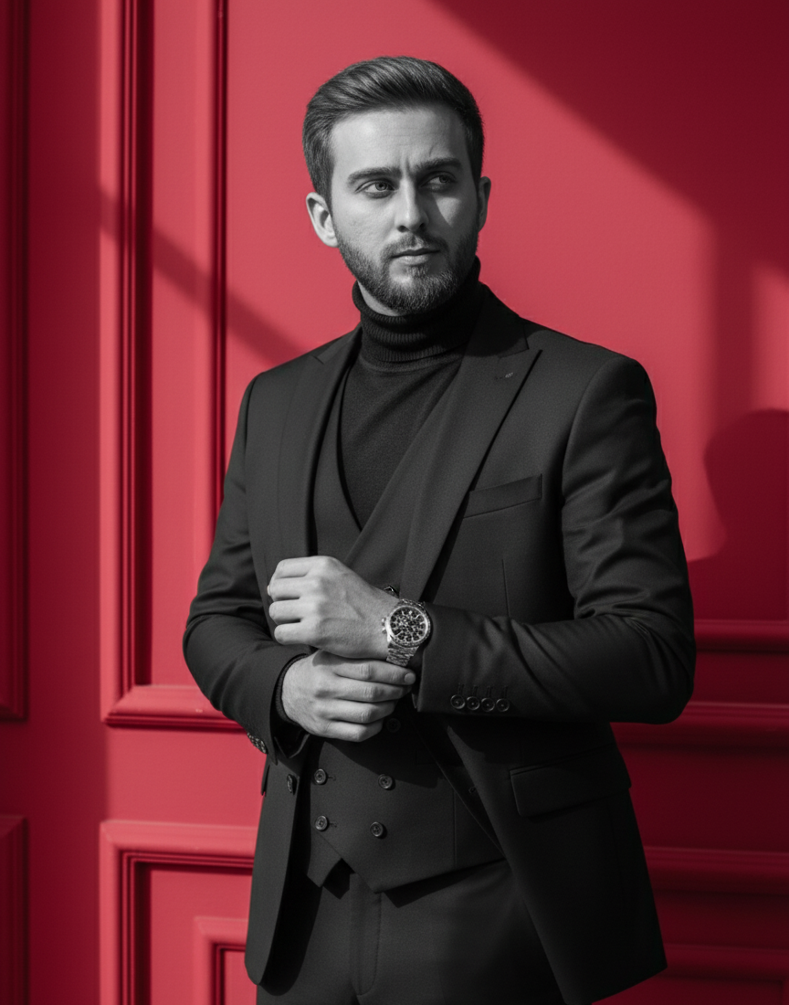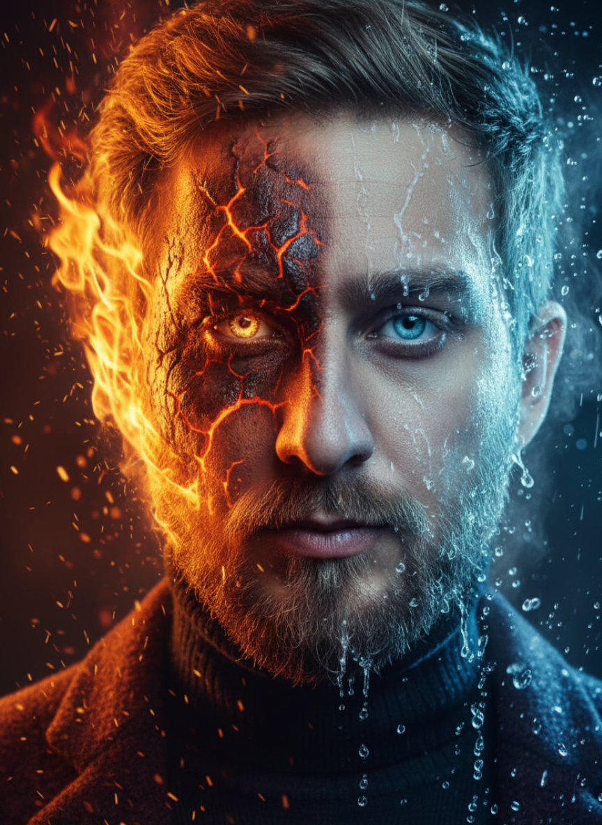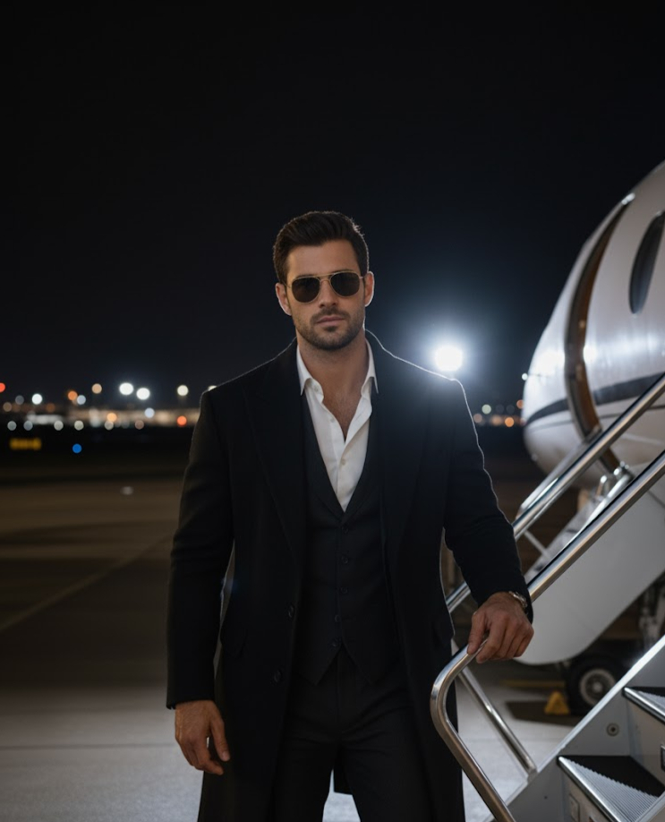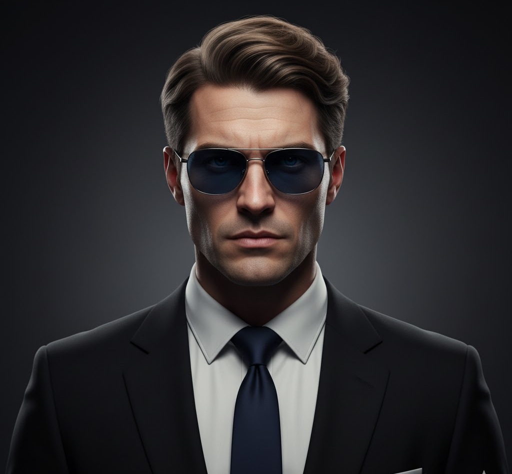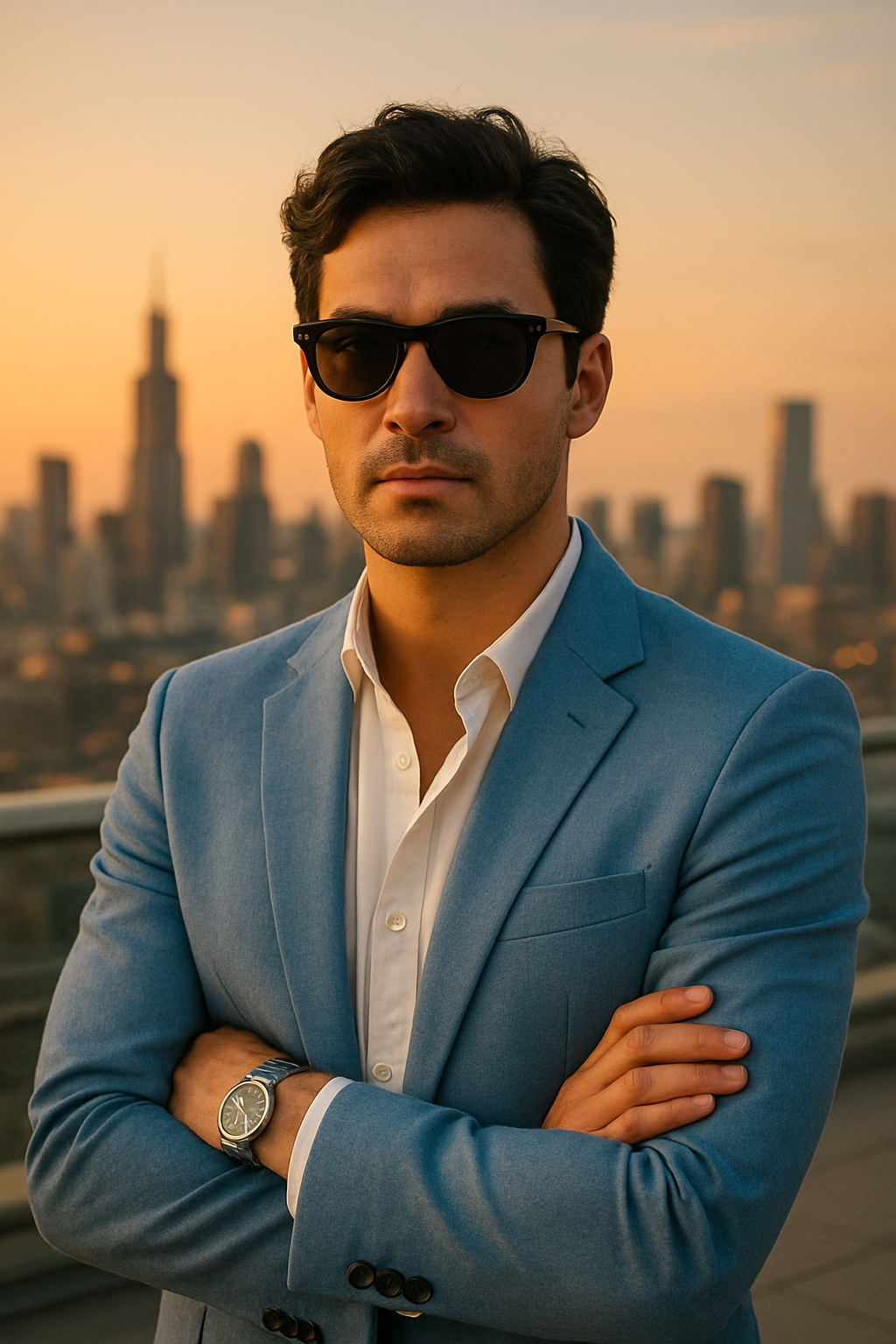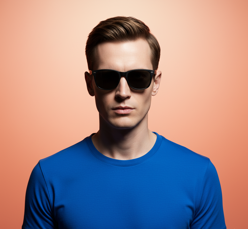 A highly stylized portrait of the same person in an image with sharp features, flawless fair skin, wearing a blue t-shirt, black sunglasses, and standing against a bold peach gradient background, confidently. The lighting is dramatic and cinematic, emphasizing his facial structure and giving a luxury fashion magazine vibe. Ultra-realistic, high-detail, editorial photography style, 4K resolution, symmetrical composition, minimal background elements. Keep the face exactly the same as in the uploaded image, if provided.