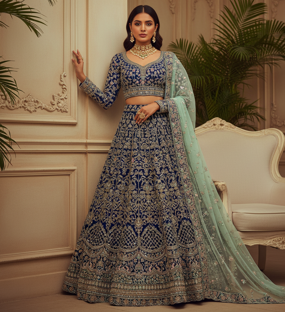 A full-body editorial portrait of a striking young woman, likely South Asian, standing elegantly in a luxurious indoor setting. She is wearing an exquisitely detailed traditional South Asian bridal or formal outfit, possibly a heavily embroidered lehenga or anarkali gown in a deep navy blue or black. The garment features intricate gold, silver, and pastel-colored embroidery, beadwork, and embellishments, covering the bodice, sleeves, and flared skirt. A delicate, sheer dupatta in a light blue or mint green hue with matching embroidery is draped over her shoulder and arm. She has a sophisticated hairstyle with dark hair parted to the side, framing her face. She is adorned with elegant jewelry, including a choker necklace and rings. Her pose is poised and confident, leaning slightly against a light-colored wall or pillar, with subtle architectural details visible. A plush, light-colored armchair and green foliage are softly blurred in the background, adding to the opulent atmosphere. The lighting is soft, warm, and professional studio-like, highlighting the rich textures and sparkle of her attire. The mood is one of refined grandeur, high fashion, and traditional beauty. Photography style: high-fashion editorial, sharp focus on the subject, shallow depth of field, rich color palette, ultra-realistic detail. Keep the face exactly the same as in the uploaded image, if provided.