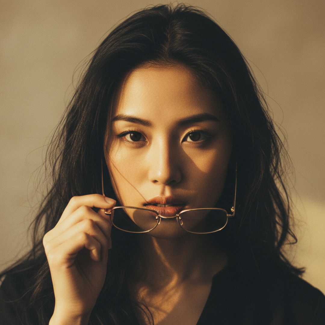 A close-up portrait of a beautiful young Asian woman with long, messy black hair, holding stylish gold-framed glasses near her lips, gazing intensely at the viewer. Soft directional lighting from the left, creating dramatic shadows and highlights on her face. Minimalist studio background, warm color grading, filmic aesthetic. Wearing a simple black blouse. High detail, sharp focus on eyes and lips, professional photography, editorial style -ar 3:4 -v 6.0. Keep the face exactly the same as in the uploaded image, if provided.