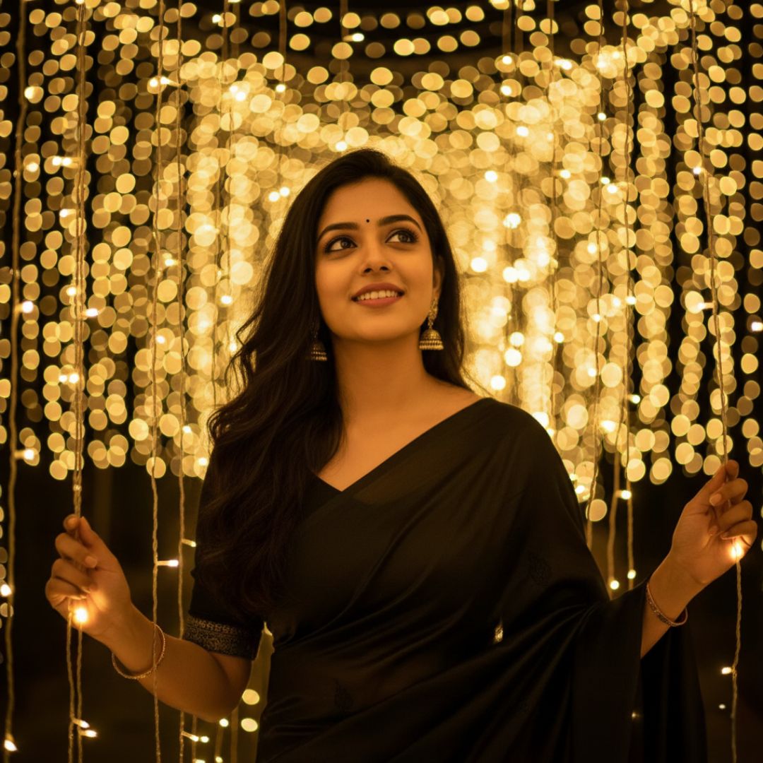 Ultra-realistic cinematic portrait of a young woman standing near glowing string lights at night. The woman is wearing a stylish black saree, with long hair, softly smiling, and gazing upward with a dreamy expression. The background is dark and blurred, with warm golden bokeh lights creating a festive, magical atmosphere. Lighting is warm, glowing, and softly illuminating the face, with smooth shadows and depth of field for a professional studio-like.. Keep the face exactly the same as in the uploaded image, if provided.