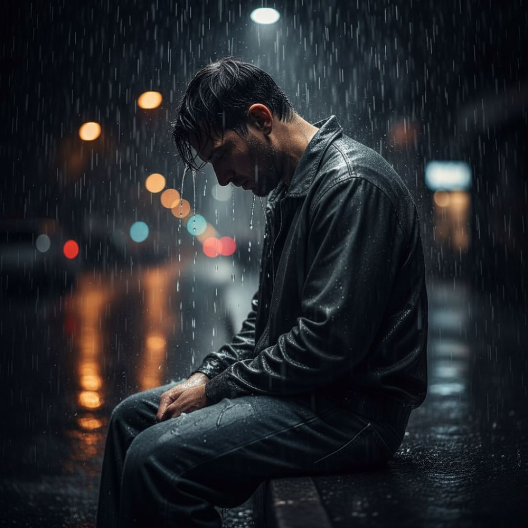 Under a single flickering streetlamp in an otherwise empty street, the subject stands in profile, head bowed as rain pours steadily, turning the asphalt into a reflective black mirror. Water streams down the cheeks and neck in clean rivulets. The light from above carves out sharp shadows along the jawline and collarbone, haloing the subject in a quiet cinematic glow. The man is wearing baggy jeans and a light, dark jacket that is soaked. Style: Close-up portrait, 50mm DSLR lens, f/1.4, shallow depth of field with bokeh in the background. Ultra-realistic skin textures with glistening water detail, hyper-detailed wet hair strands, 8K resolution, 4:3 crop. Split-key lighting from the lamp above and natural falloff into shadow behind. Mood: Introspective solitude, frozen in thought. Keep the face exactly the same as in the uploaded image, if provided.