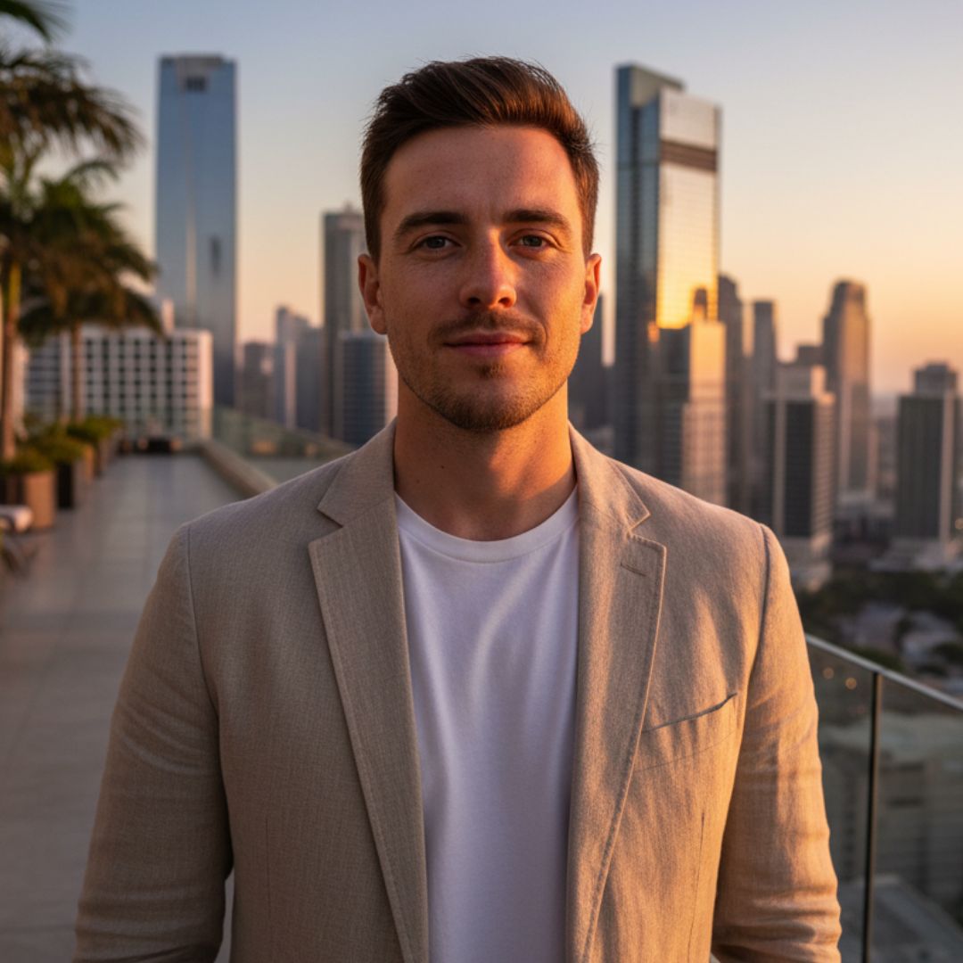 Ultra-realistic portrait of a young man standing on a luxury penthouse balcony at golden hour, city skyline, clear facial details, wearing an open beige blazer, warm light on his face, cinematic 85mm photo style. Keep the face exactly the same as in the uploaded image, if provided.