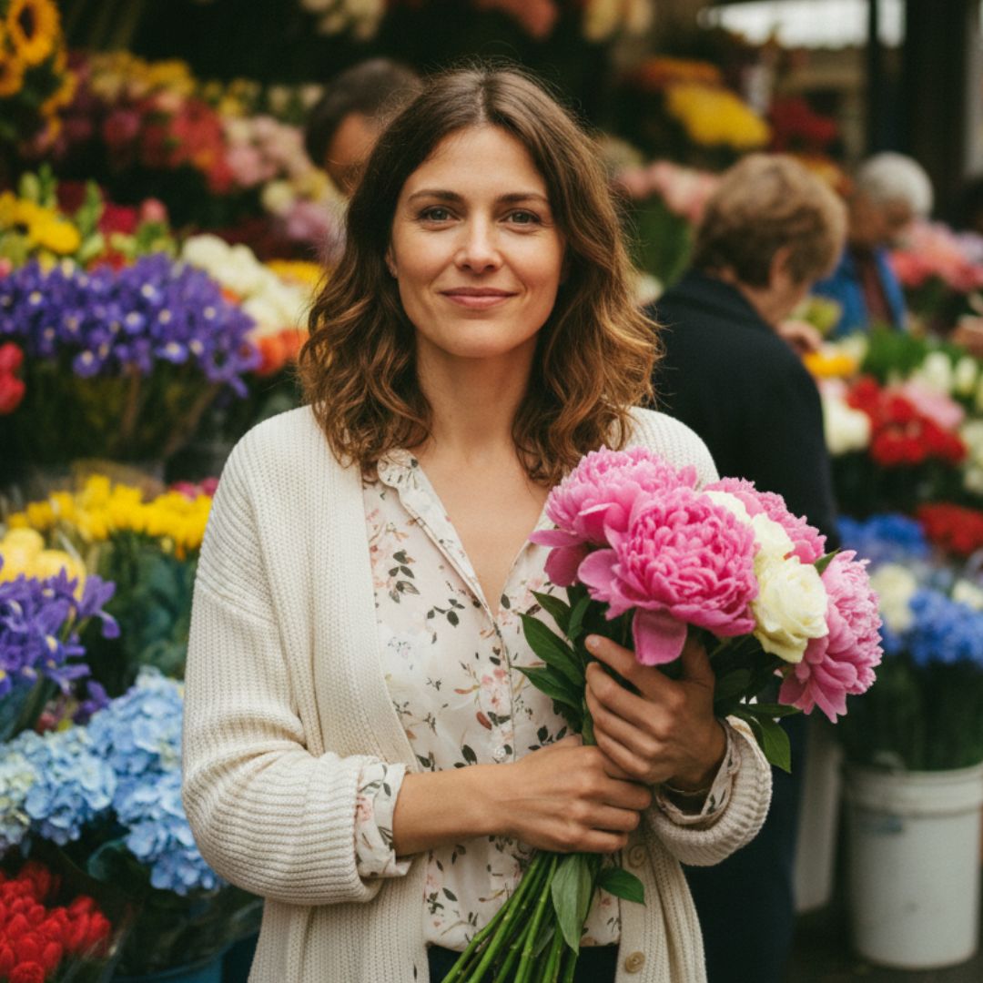 Realistic portrait of a woman standing in a colorful flower market, soft daylight, gentle smile, natural expression, cinematic photography style, lifelike detail. Keep the face exactly the same as in the uploaded image, if provided.