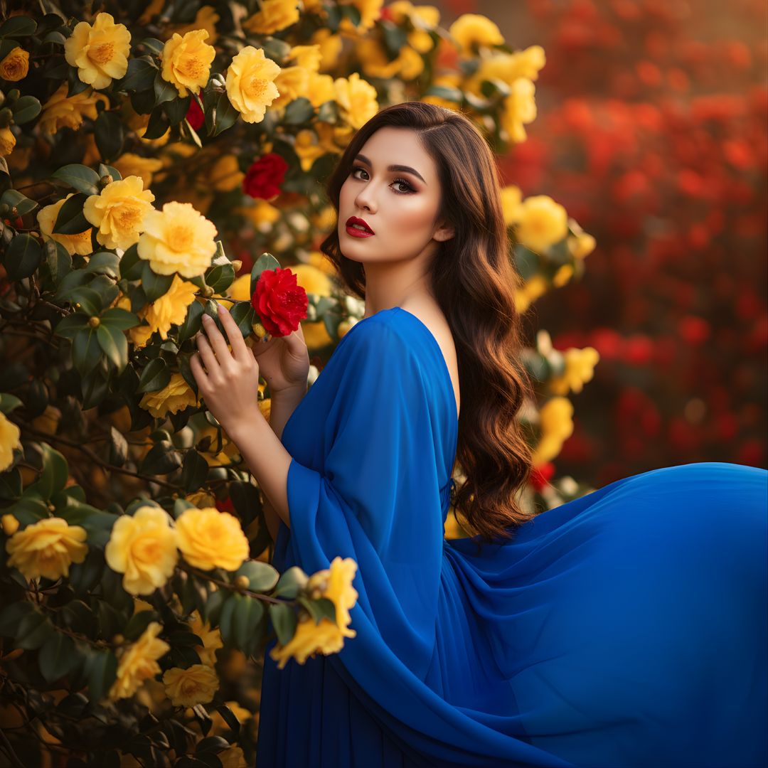 Beautiful young woman surrounded by blooming yellow camellia flowers, wearing a blue dress, long flowing dark hair, soft bold makeup with red lips, intense yet gentle gaze over shoulder, her hand gently touching a crimson bloom, surrounded by glossy green leaves Camera & Style: portrait shot, 85mm lens, f/1.8 aperture, rich red floral bokeh, contrast tones, warm romantic lighting, fairytale dramatic tone Modifiers: --ar 2:3 --raw. Keep the face exactly the same as in the uploaded image, if provided.