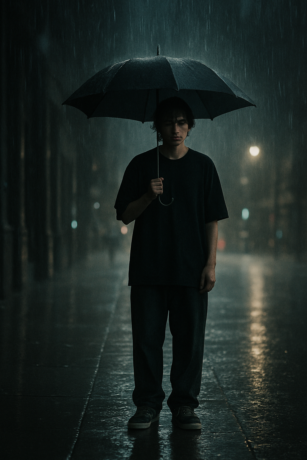 Cinematic 4:3 shot of me standing still on a rainy city sidewalk. I'm wearing an oversized black T-shirt, baggy pants, and sneakers. Holding an umbrella with one hand while rain pours heavily around me. Moody lighting, shallow depth of field, reflections on wet pavement, soft backlight halo. The film still has slightly desaturated colors. Focus on emotion, solitude in the storm. Keep the face exactly the same as in the uploaded image, if provided.