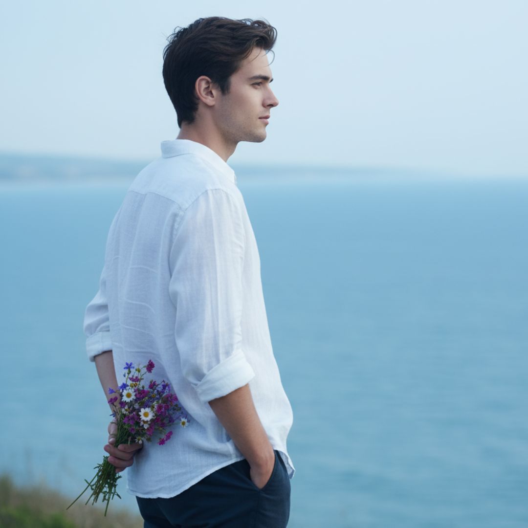 A 21-year-old stylish young man stands near the sea, facing sideways with a calm and thoughtful expression. He wears a loose white shirt with rolled-up sleeves and dark pants. One hand rests casually in his pocket, while the other holds a bouquet of small, colorful flowers (purple, pink, and white) behind his back. His body is slightly turned to the side as he looks away, the gentle ocean breeze adding to the tranquil atmosphere. The background features a wide blue ocean, its surface calm with a faintly blurred distant shore along the soft horizon line. The camera captures a mid-shot from the side, framing the man from the waist up against the serene ocean backdrop. The soft, natural daylight bathes the scene with a cool blue tone, evenly diffused across the frame, creating a dreamy cinematic aesthetic with no harsh shadows. The focus is slightly soft, enhancing the peaceful and contemplative mood of the moment, while realistic skin tones bring the scene to life. Keep the face exactly the same as in the uploaded image, if provided.