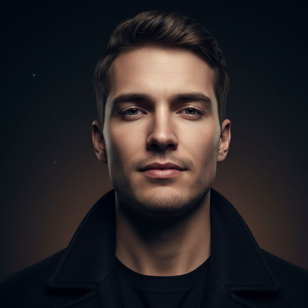 Create an ultra-realistic portrait of a young man based on the uploaded selfie. The subject faces the camera with a slightly raised chin and confident expression. Lighting is cinematic and dramatic, coming from above, creating smooth highlights on the skin and subtle shadows under the jawline. Background is a deep warm gradient (dark blue-black tones), minimal and clean. Outfit: dark coat over a simple shirt, adding contrast against the background. The overall mood is intense, moody, and editorial — professional studio quality, high detail, photorealistic, 4K resolution. Keep the face exactly the same as in the uploaded image, if provided.