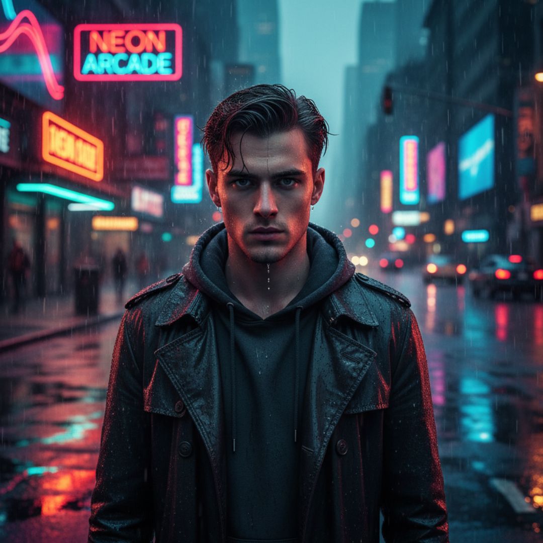 "Cinematic portrait of a young man standing on a rain-soaked city street under neon signs, eyes fixed on camera, wet reflections on pavement, ultra-HD clarity, 50mm lens photo realism." Keep the face exactly the same as in the uploaded image, if provided.