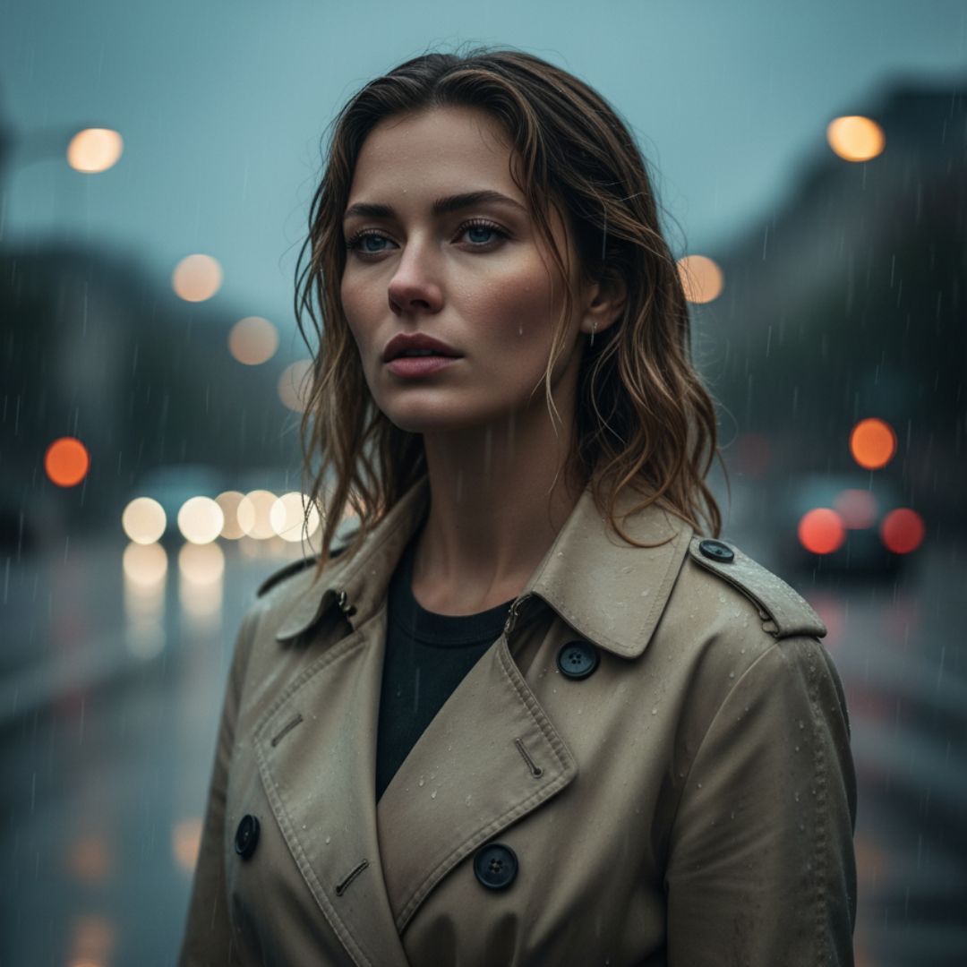 “Ultra-realistic cinematic portrait of a woman in a beige jacket standing in light rain, moody sky, soft focus background, clean natural skin tone.” Keep the face exactly the same as in the uploaded image, if provided.