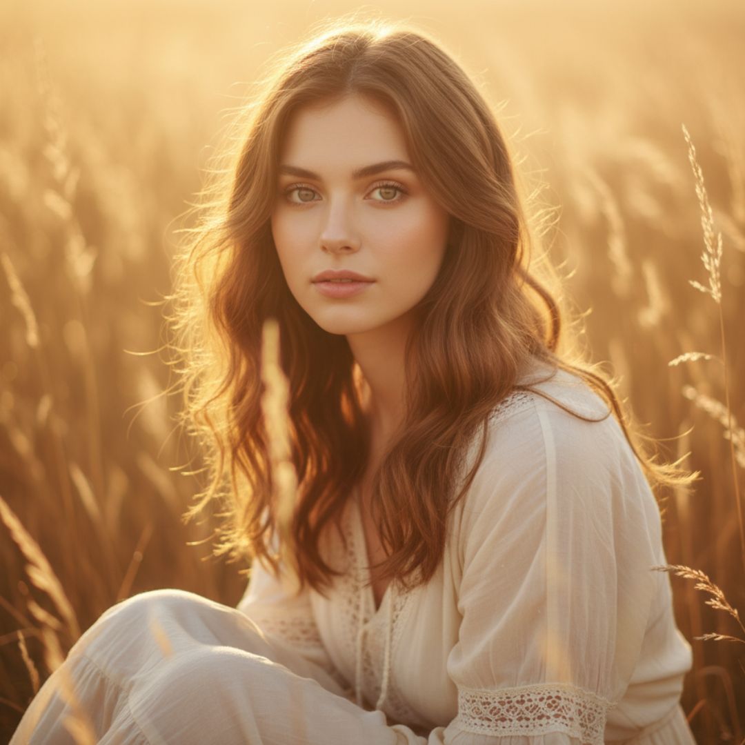 "Girl sitting in a field of tall grass during golden hour, sunlight hitting her face, eyes directly on camera, warm tones, 4K shallow focus, dreamy atmosphere." Keep the face exactly the same as in the uploaded image, if provided.