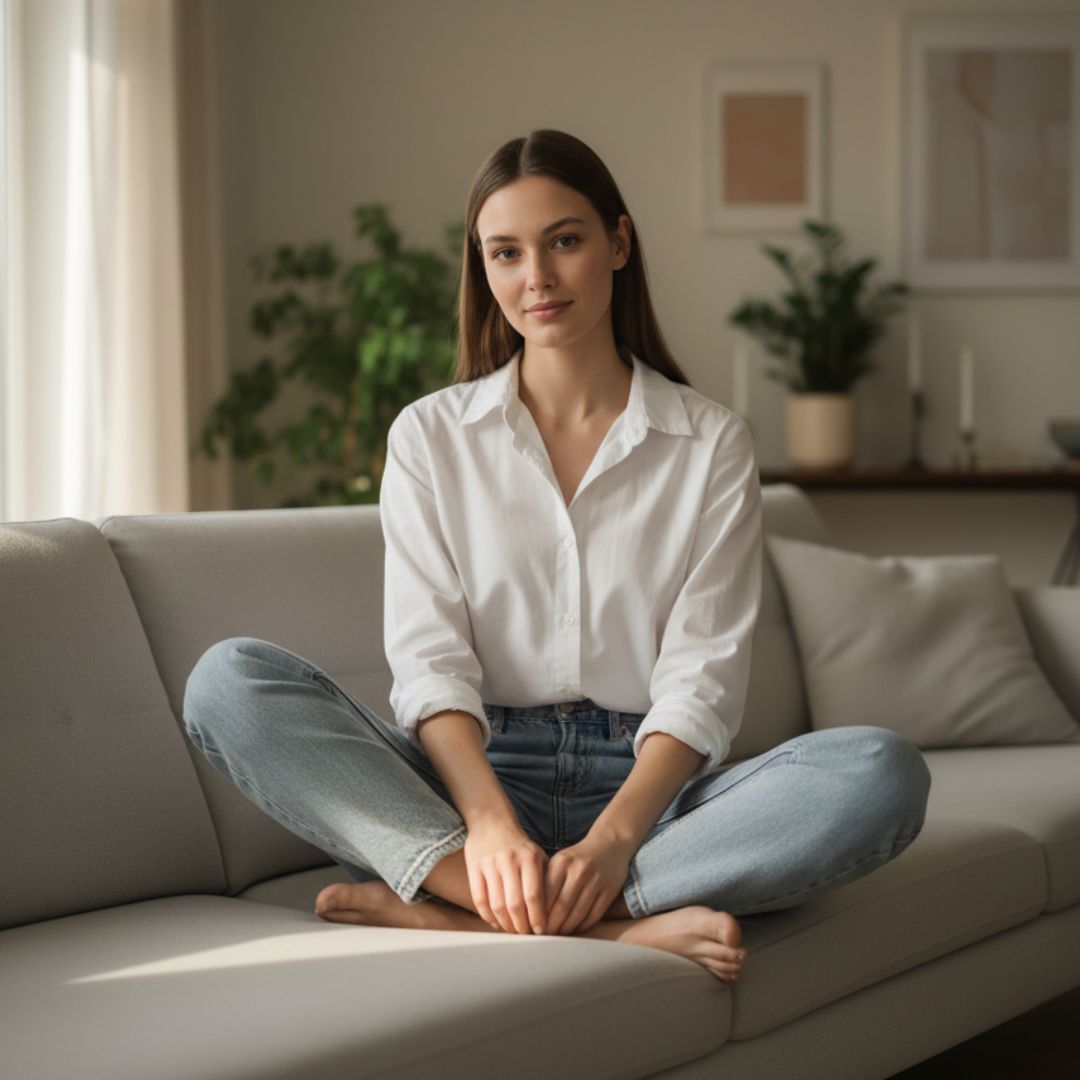 “Girl wearing a white shirt and jeans sitting on a modern sofa, natural daylight, soft color tones, clean human face.” Keep the face exactly the same as in the uploaded image, if provided.