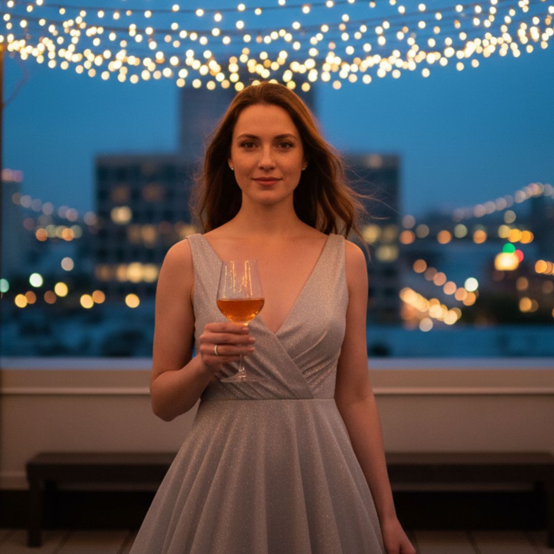Realistic photo of a woman standing under fairy lights on a rooftop, holding a glass, wearing a silver dress, her eyes focused on the camera, warm golden lighting, lifelike facial details. Keep the face exactly the same as in the uploaded image, if provided.