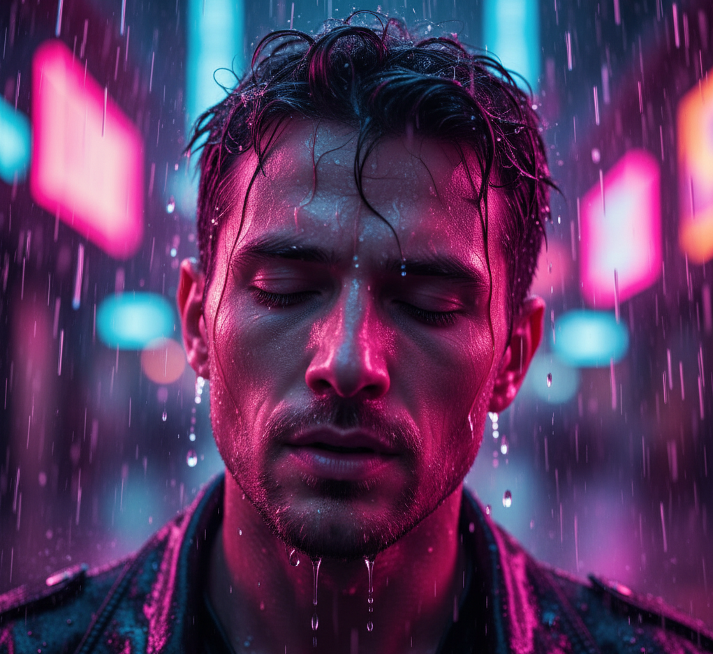 Ultra-detailed portrait of a man under neon rain. His face is wet, shiny, and lit by vibrant light: pink, purple, and electric blue neon lights. Moody and cinematic aesthetic, water droplets on skin and hair. Bokeh background, shallow depth of field, dramatic lighting, and an emotional and dreamy look. Keep the face exactly the same as in the uploaded image, if provided.