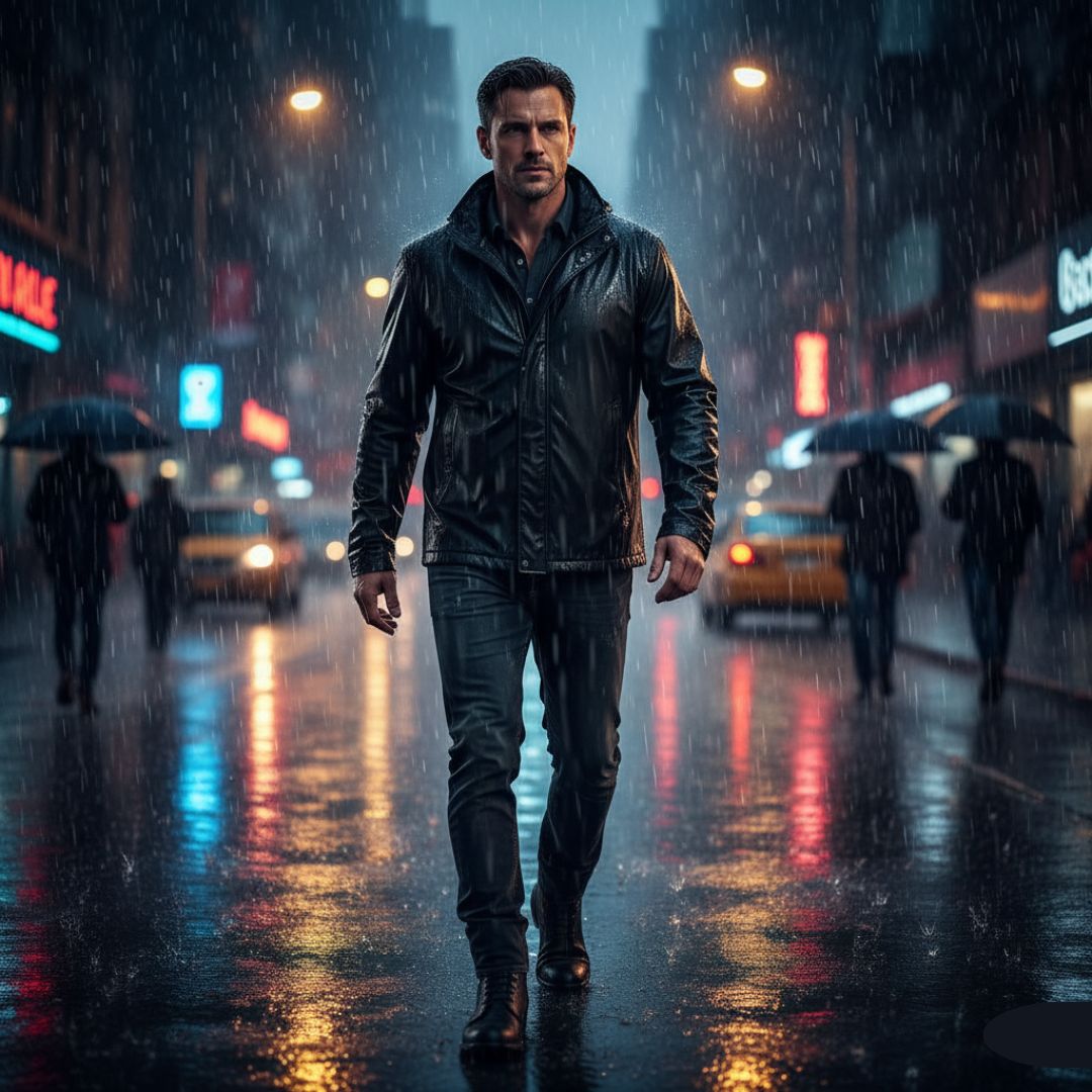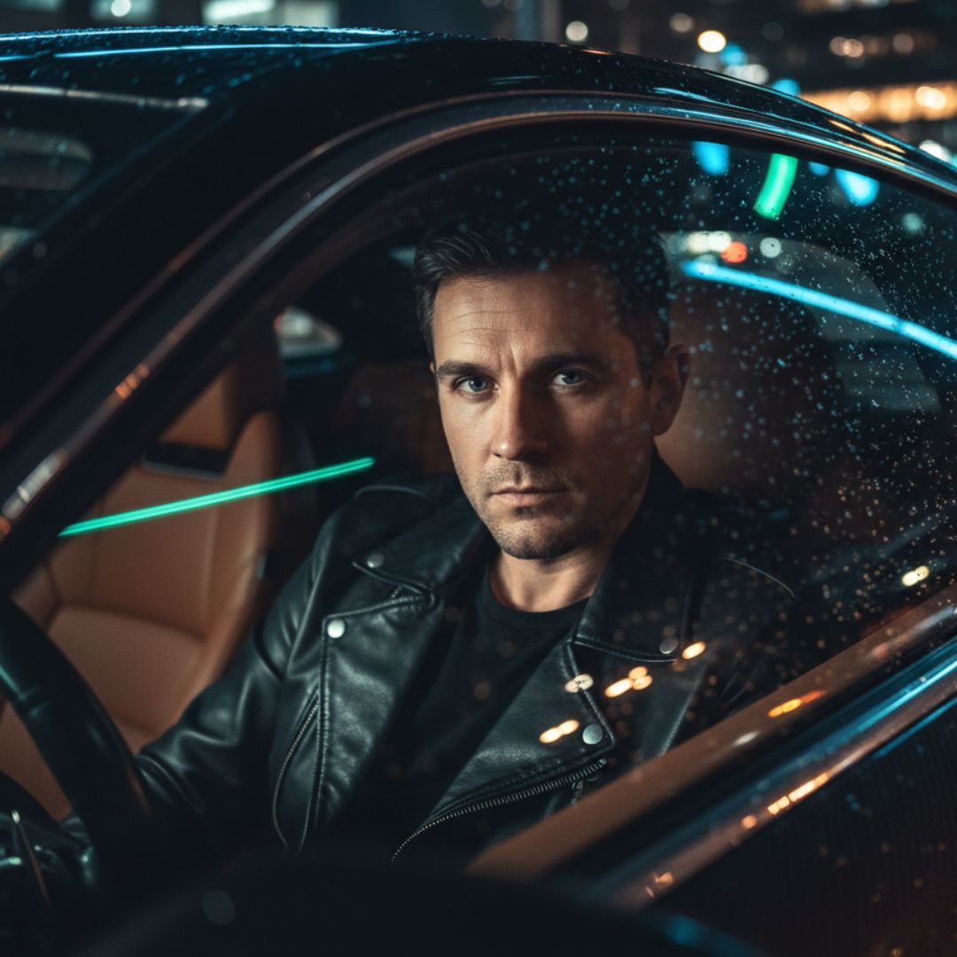Realistic photo of a man sitting inside a luxury car at night, neon lights reflecting on windows, wearing a black leather jacket, moody cinematic lighting, clear face and eyes, shallow depth of field. Keep the face exactly the same as in the uploaded image, if provided.