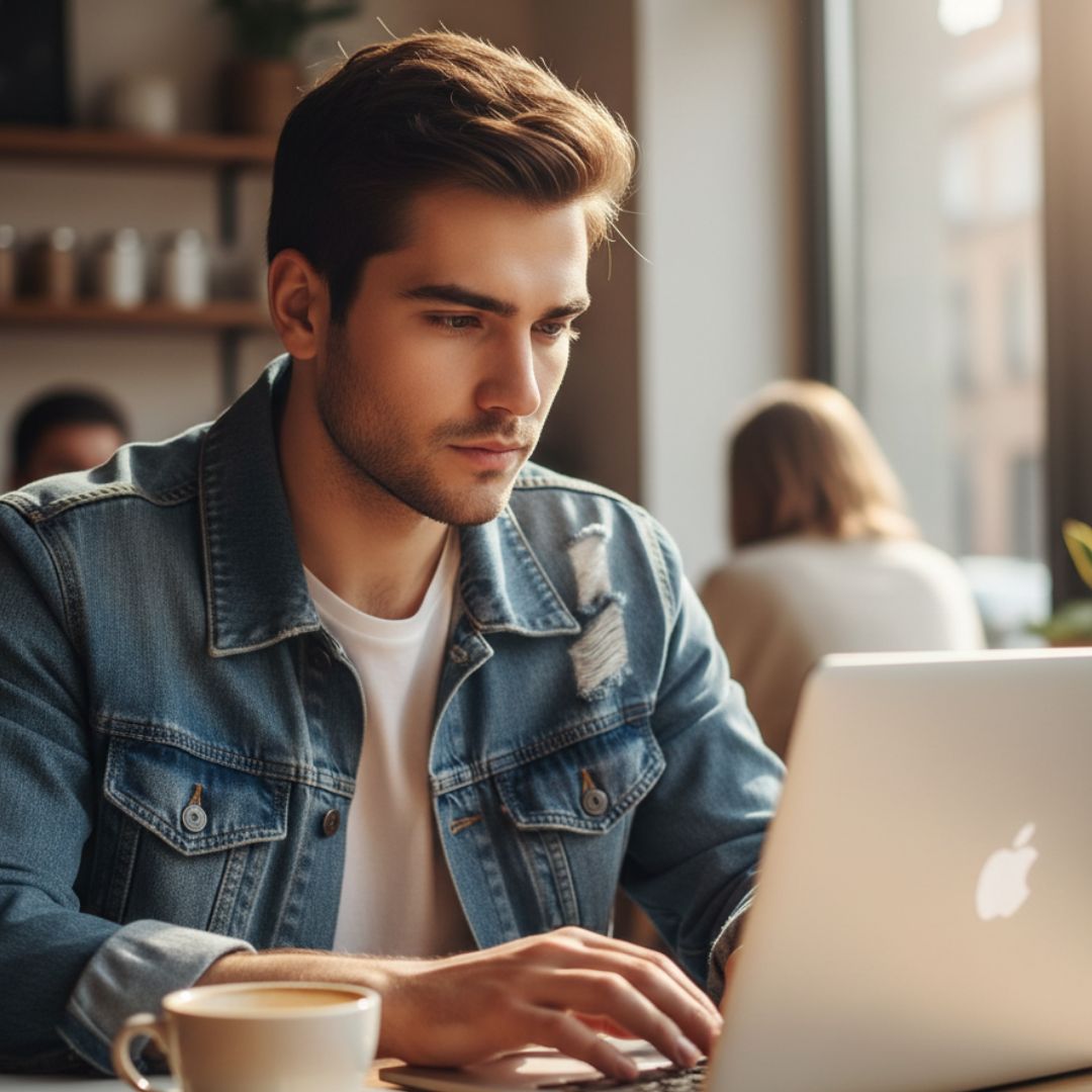 "Handsome young man sitting in a coffee shop, wearing a white shirt and denim jacket, natural morning light, working laptop, bokeh background, Canon EOS R5, ultra-detailed focus on eyes." Keep the face exactly the same as in the uploaded image, if provided.