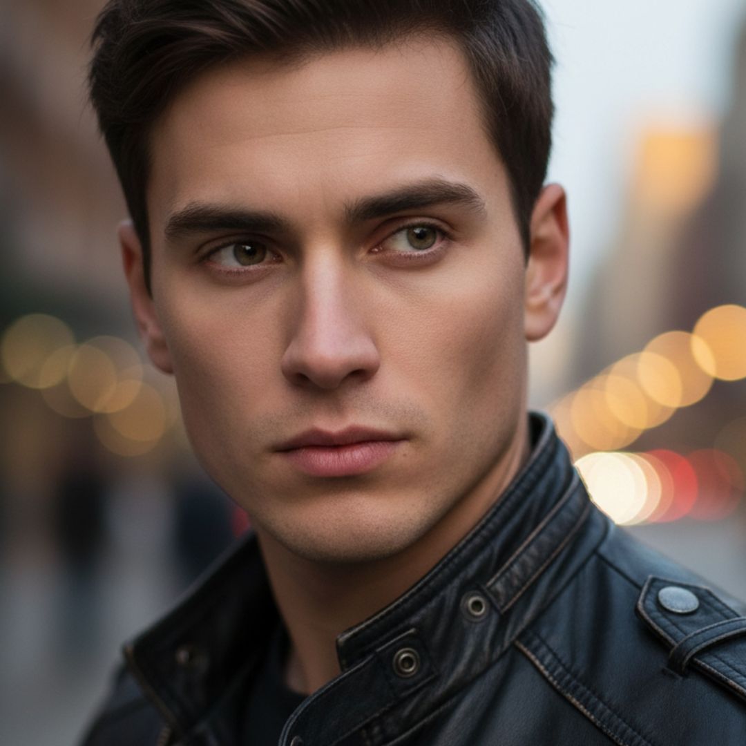 "Ultra-realistic portrait of a young man with sharp features and hazel eyes, wearing a black leather jacket, cinematic lighting, soft background blur, DSLR photo style, 85mm lens, 4K quality." Keep the face exactly the same as in the uploaded image, if provided.