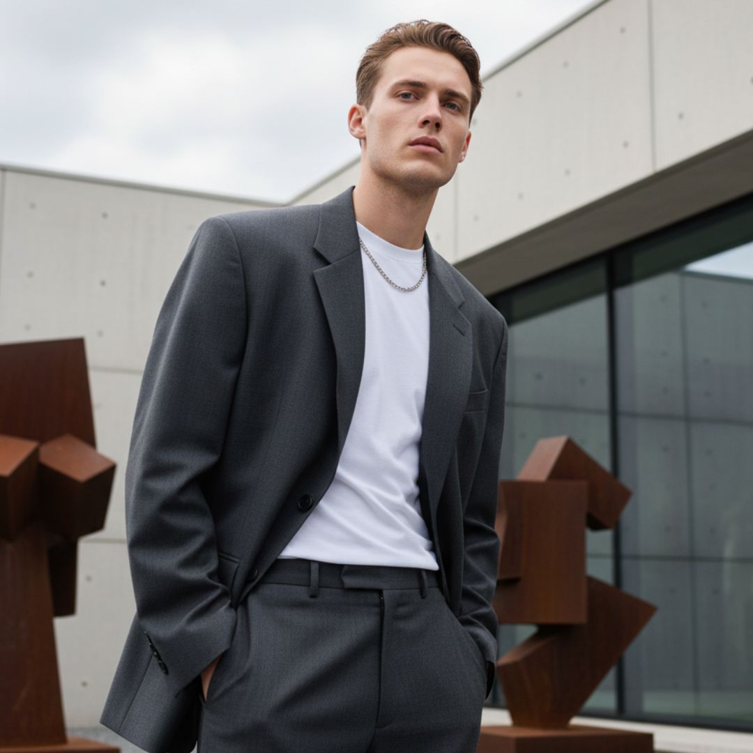 “Fashionable young man posing near an art museum, minimalist modern outfit, clear and natural human face, cloudy daylight, sharp focus on eyes and natural skin texture.” Keep the face exactly the same as in the uploaded image, if provided.