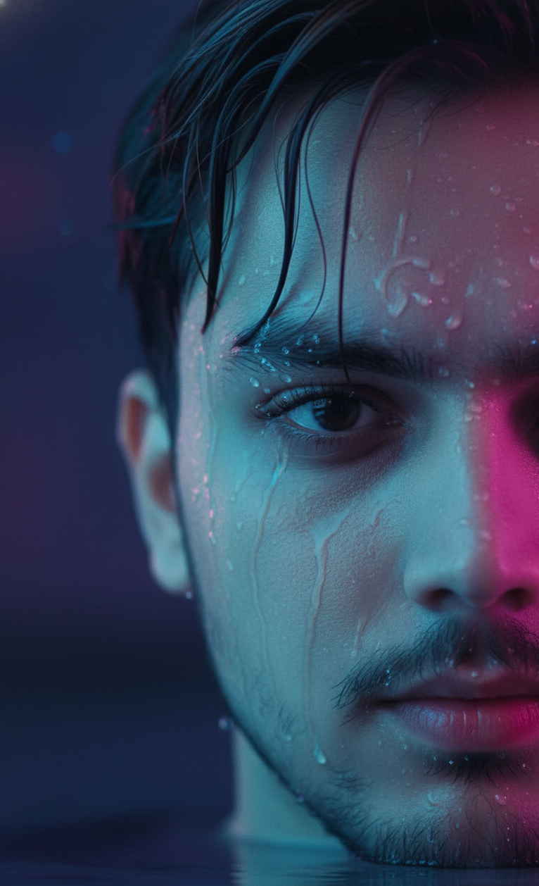 A hyper-realistic close-up portrait of a young face (use uploaded face, expression, emotions, impressions, eyes, nose, aesthetic) with only the left half visible and partially submerged in water. The scene is illuminated dramatically with soft, ambient blue and pink neon lighting, casting colourful reflections on her wet skin and damp hair. Water droplets and small bubbles cling to his face, enhancing the cinematic mood. The skin texture, slight beard stubble, and intense eye focus are clearly visible. Keep the face exactly the same as in the uploaded image, if provided.