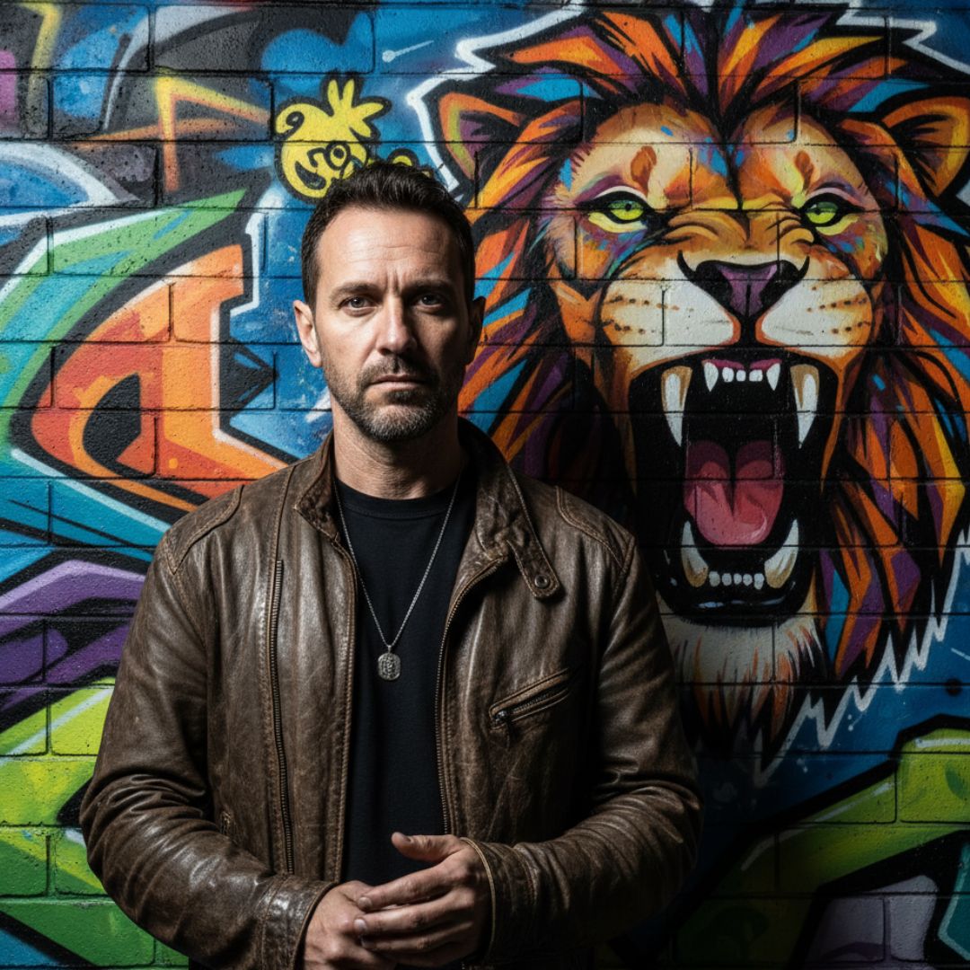 "Realistic portrait of a man standing in front of a graffiti wall, bold street colors behind him, intense eyes facing the camera, high contrast lighting, 4K crisp shot." Keep the face exactly the same as in the uploaded image, if provided.