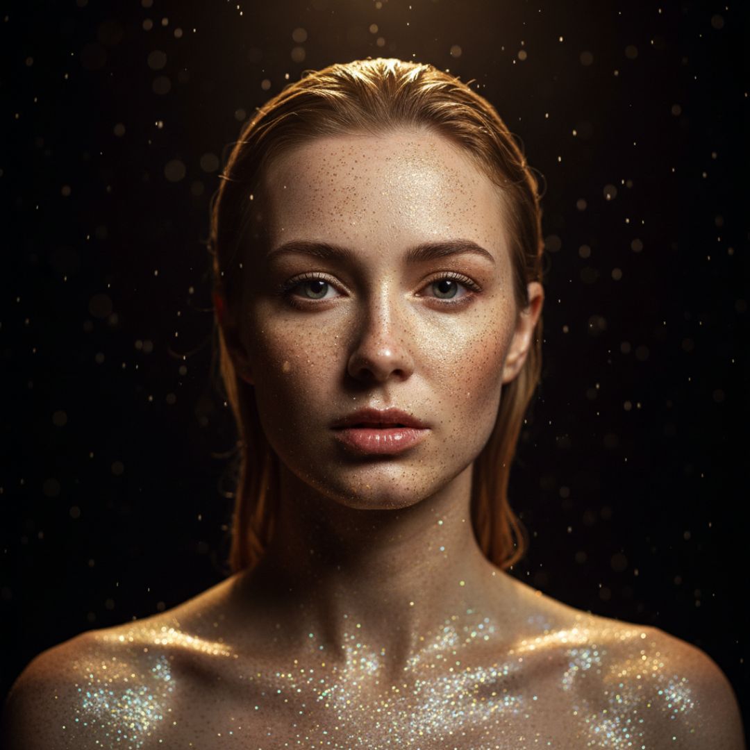 Generate a hyper-realistic head-and-shoulder portrait of a woman in a dark studio setting. Her pale, freckled skin is covered in a fine layer of wet glitter-gold, silver, and subtle flecks of iridescent shimmer. Her damp gold hair is slicked back, framing her face. Water droplets and glitter glisten together across her collarbones, cheeks, and lips. Her eyes focus camera. The lighting is dramatic and warm, coking from one soft source above, catching the sparkle across her features. The background is deep black with floating soft bokeh, like suspended dust or light particles. Expression is calm, most trance-like. 4:5 portrait ratio, cinematic and emotionally striking. Keep the face exactly the same as in the uploaded image, if provided.