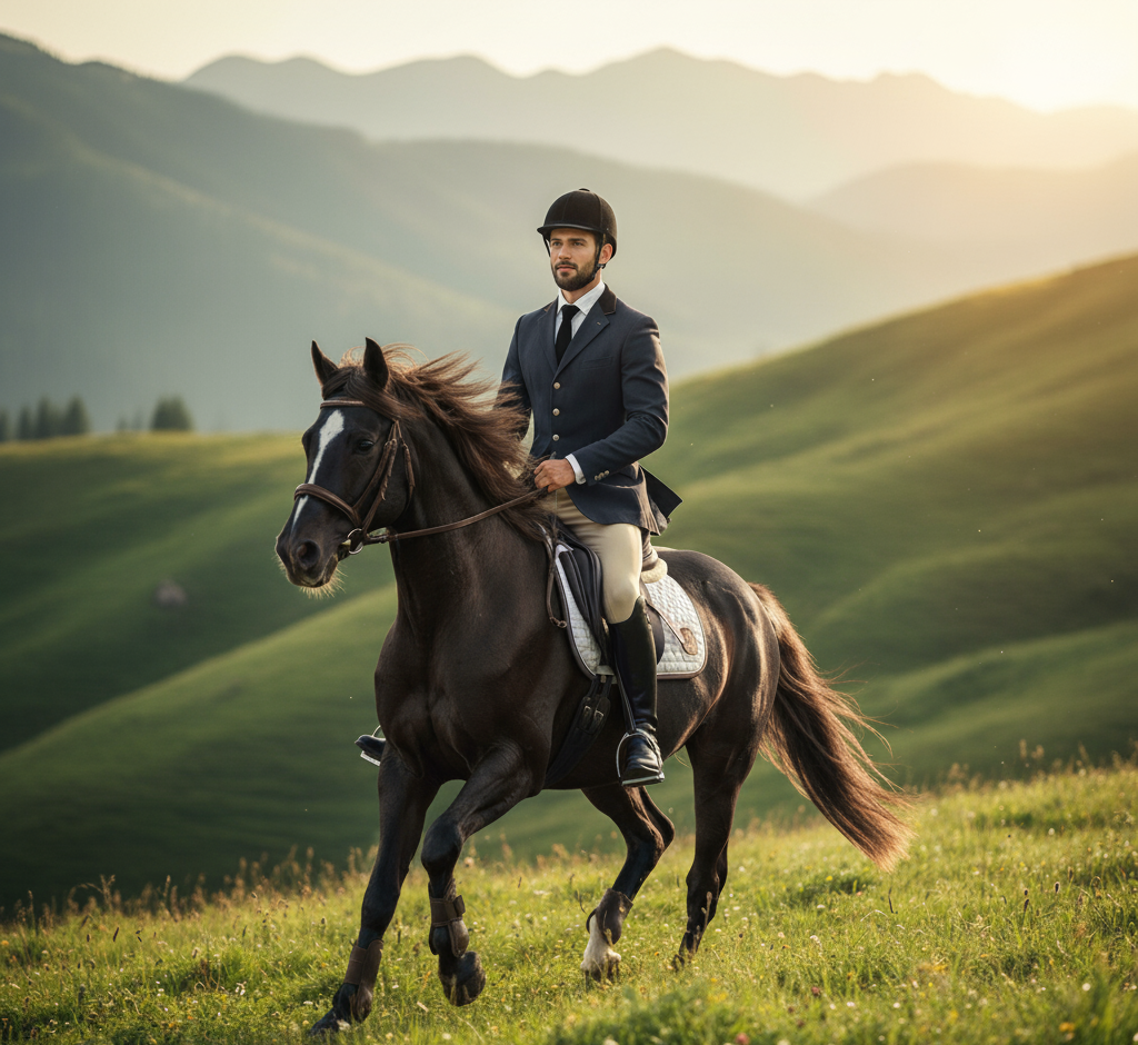 A young, handsome, slim, and smart 29-year-old man with a well-groomed beard and neat formal hairstyle, dressed in an elegant horse-riding suit with a black tie. He is confidently riding a majestic black horse through a lush green mountain hillside. The background shows realistic, rolling hills, fresh grass, and soft sunlight illuminating the scene. The atmosphere feels natural, vibrant, and cinematic — capturing the grace of both rider and horse in motion. Ultra-realistic, high detail, DSLR-quality, shallow depth of field, golden-hour lighting, 8K. Keep the face exactly the same as in the uploaded image, if provided.