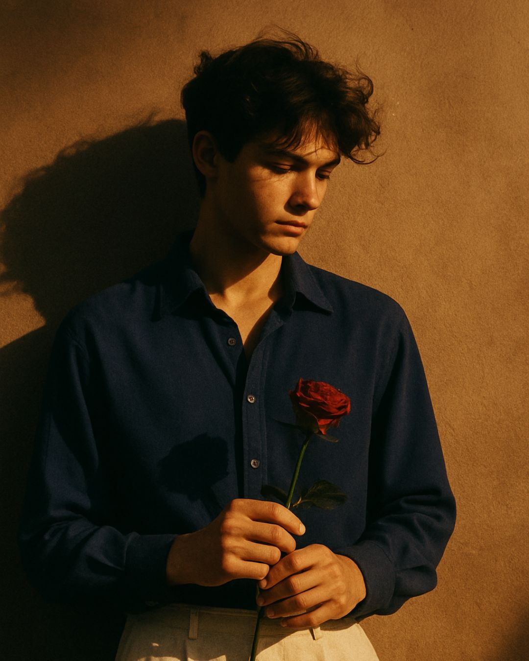 A retro vintage grainy but bright image of the reference picture, but draped in a perfect blue wine color, Pinteresty aesthetic retro shirt with white pant and holding a rose flower in hands. It must feel like a 90s movie and romanticise a windy environment. The boy is standing against a solid wall, deep shadows and contrast drama, creating a mysterious and artistic atmosphere where the lighting is warm. Keep the face exactly the same as in the uploaded image, if provided.