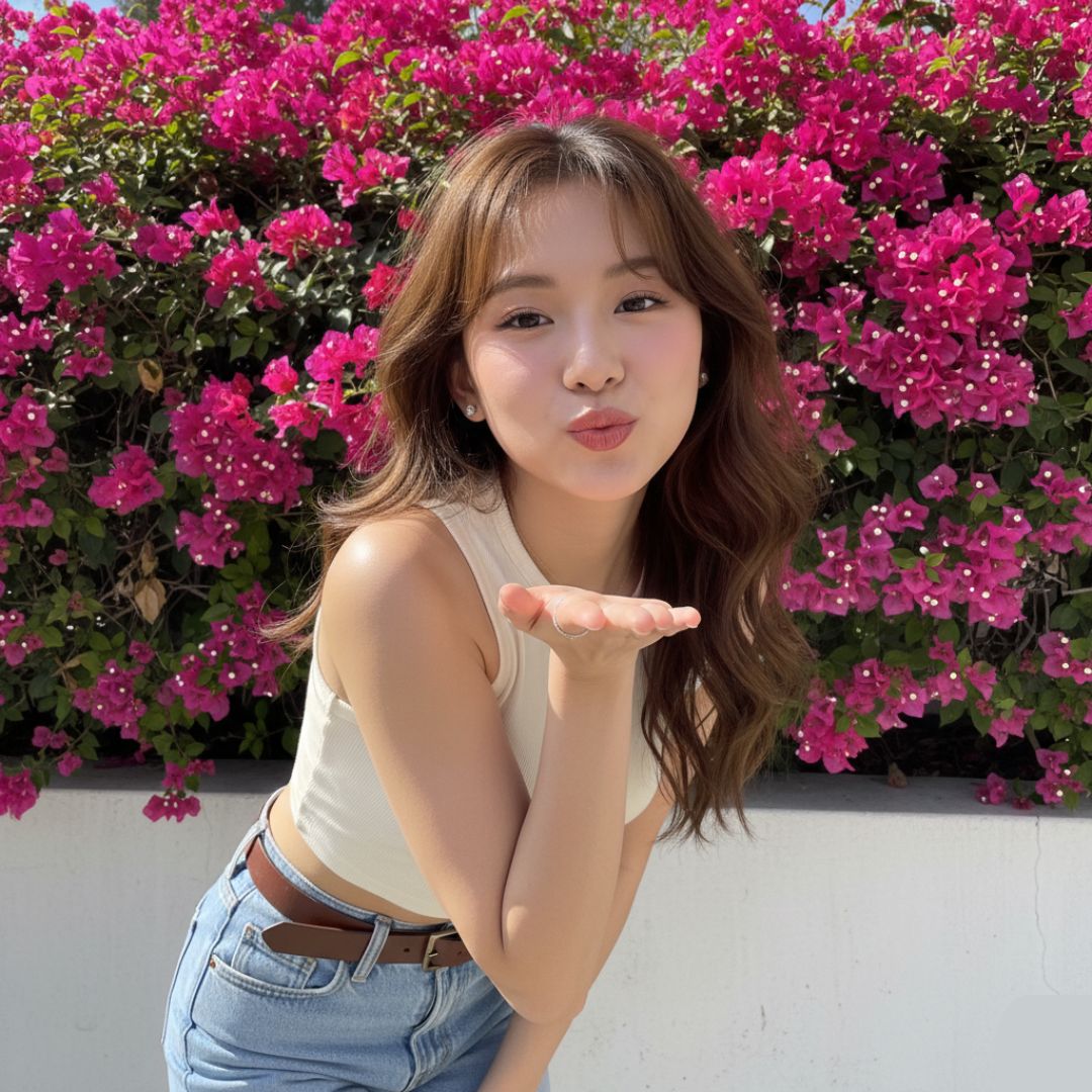 Berpose "cium jauh" dengan bibir pouty, badan sedikit condong ke depan.