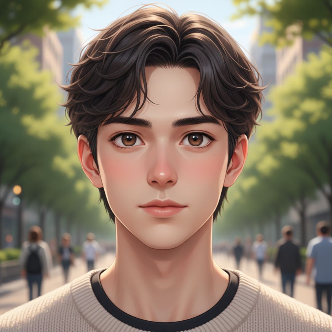 Create a highly detailed and ultra-realistic close-up portrait of a young man with a soft, anime-inspired appearance. He has large, expressive brown eyes and a gentle, rosy complexion. His short, wavy dark hair frames his face beautifully. The man is dressed in a light beige sweater over a black shirt, adding a touch of casual elegance to his look. The background features a softly blurred urban setting with hints of greenery and people in the distance, creating a lively yet serene atmosphere. The overall style should blend realism with a touch of anime aesthetics, capturing the softness of his skin, the shine in his eyes, and the detailed textures of his hair and clothing. The lighting should be even and natural, enhancing the delicate features of his face and the vibrant colors of the scene. Aspect ratio 1:1. Keep the face exactly the same as in the uploaded image, if provided.