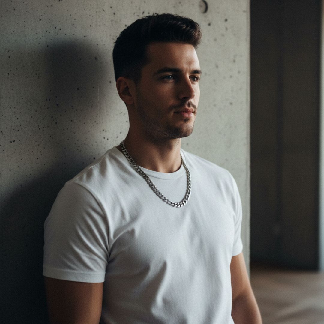 “Man wearing a white shirt and a silver chain, standing beside a minimal wall, natural daylight, 35mm film tone, realistic details.” Keep the face exactly the same as in the uploaded image, if provided.