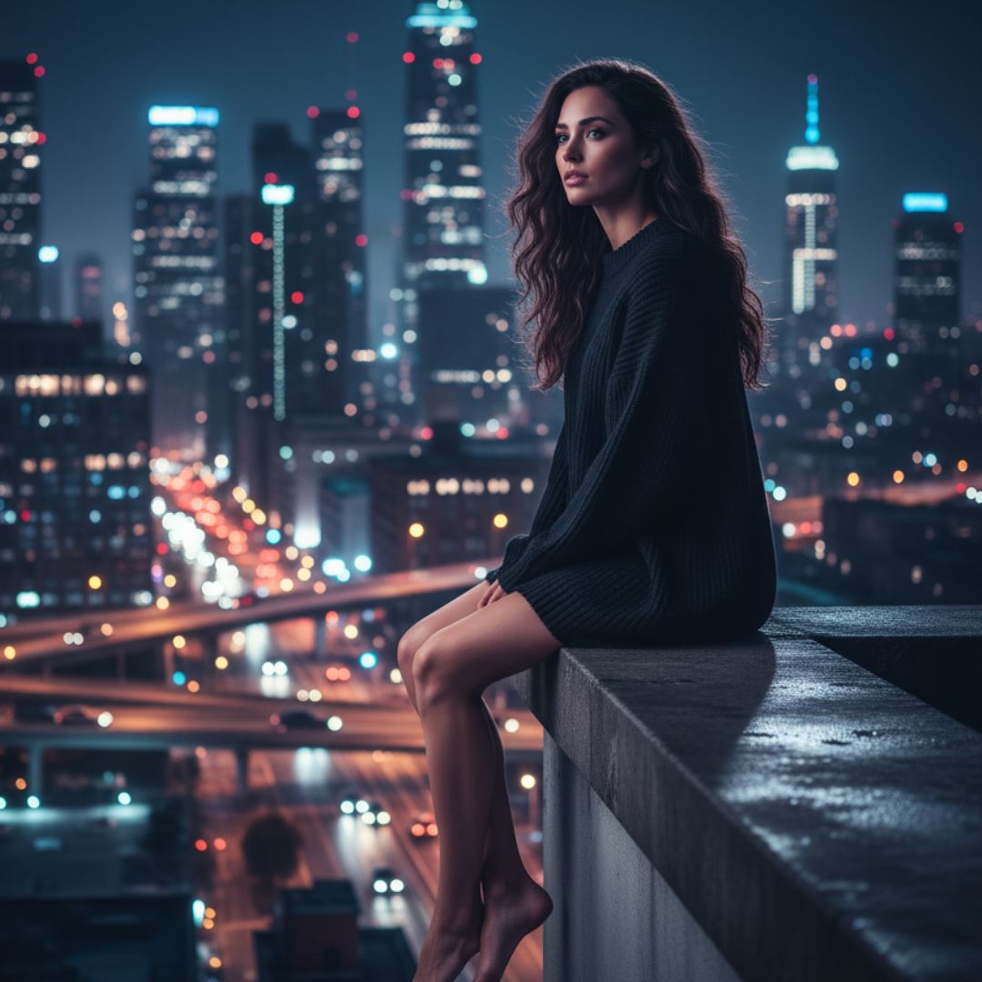 “Ultra-realistic portrait of a woman sitting on rooftop edge, city behind her at night, gentle wind, cinematic color tones, clear facial focus.” Keep the face exactly the same as in the uploaded image, if provided.