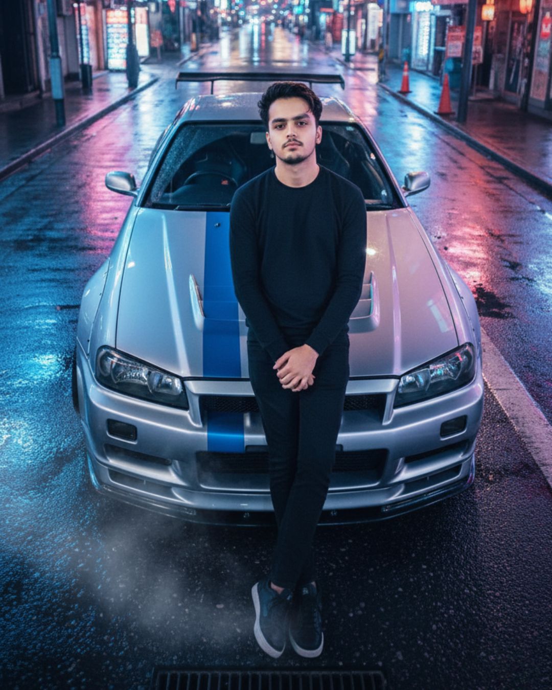 Create an ultra-realistic full-body portrait of the person in the uploaded photo, styled in a Japanese street-racing atmosphere. The subject stands confidently, leaning casually against a silver sports car with a bold blue racing stripe — resembling a Nissan Skyline R34 with a full modified body kit. Camera angle is from above, looking down, making the subject gaze upward toward the lens. Scene set at night in an urban city environment with glowing neon blue lights, metallic gray reflections, and warm street lamps. Atmosphere is mysterious, cinematic, and photorealistic, evoking the mood of Japanese street racing culture. Lighting emphasizes reflections on the car body and highlights the subject with a mix of cool neon tones and golden streetlight accents. Cinematic composition, high detail, realistic textures on clothing, skin, and car, 4K resolution. Keep the face exactly the same as in the uploaded image, if provided.