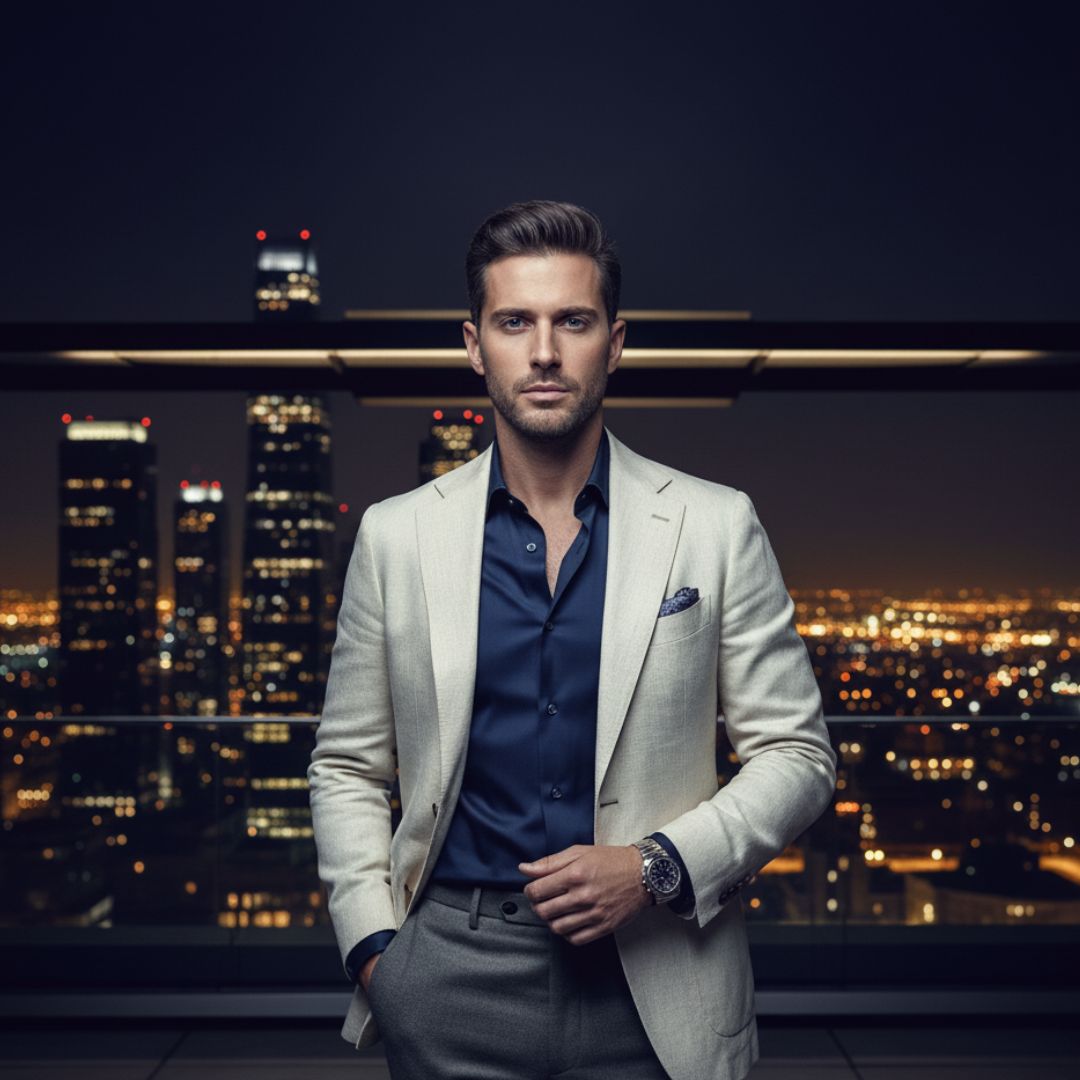 Produce a luxurious rooftop portrait with darkline in the background. Maintain the original selfie's face without any AI face modification. The subject is in a smart-casual outfit — open collar shirt, linen blazer, watch visible on wrist. Moonlight casts soft white tones across the skin. Behind, a modern city skyline fades into warm bokeh. Clean, editorial look with professional photography vibes. 4K clarity: Keep the face exactly the same as in the uploaded image, if provided.