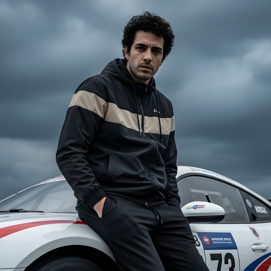 Photograph of a man with dark curly hair (don't change the face, make sure the face is exactly like the uploaded image), wearing a black and beige striped windbreaker and black pants, sitting on the roof of a white race car with decals. His focused on the camera, set against a dark, moody, and overcast sky. --ar 9:16 --style raw --v 6.0