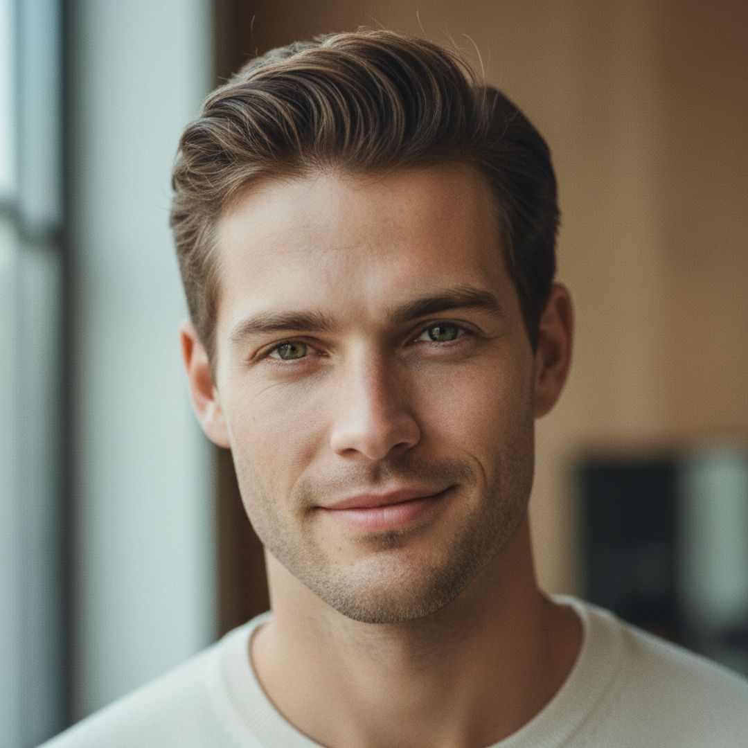 "Close-up portrait of a confident young man with green eyes and freckles, soft smile, natural daylight, 8K ultra-HD clarity, film grain effect." Keep the face exactly the same as in the uploaded image, if provided.