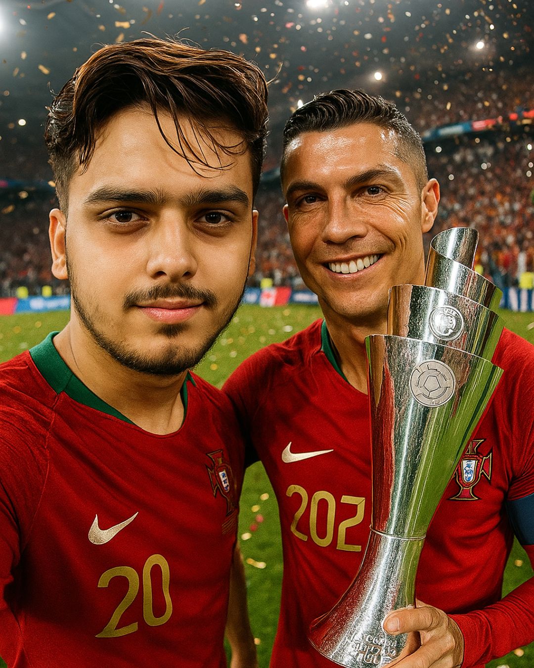 ULTRA-REALISTIC VERTICAL SELFIE. A YOUNG MAN (USE UPLOADED FACE) AND CRISTIANO RONALDO, BOTH WEARING 2025 PORTUGAL JERSEYS. THE YOUNG MAN IS CLICKING THE SELFIE. RONALDO HOLDS THE UEFA NATIONS LEAGUE 2025 TROPHY. BACKGROUND: PACKED STADIUM, CONFETTI, STADIUM LIGHTS, VICTORY VIBE. APPLY FISHEYE WIDE-ANGLE SELFIE EFFECT. MAINTAIN ACCURATE FACES, SKIN TEXTURES, LIGHTING, AND CINEMATIC REALISM. TROPHY CLEARLY IN RONALDO'S HANDS, NO OVERLAP BEHIND HEADS. Keep the face exactly the same as in the uploaded image, if provided.