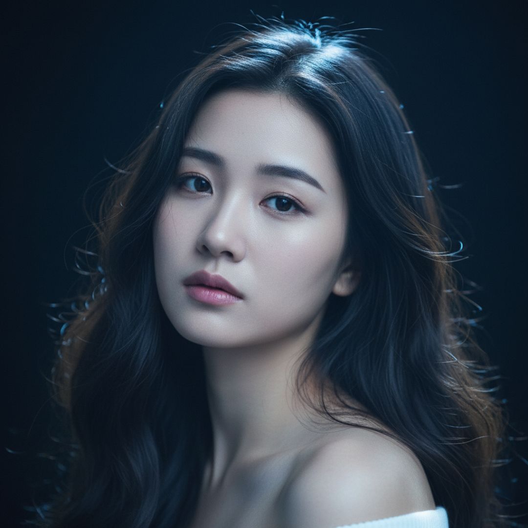 Create an ultra-sharp 8K hyper-realistic studio portrait of a beautiful young East Asian woman, possibly in her late teens or early twenties, with long, black, wavy hair and thin, light eyebrows.