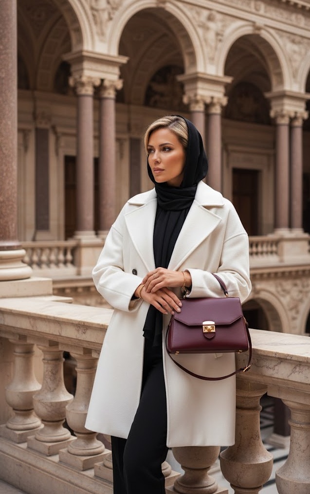 A stylish and elegant young woman, likely of Middle Eastern or North African descent, captured in a three-quarter length editorial portrait within a grand, classical architectural interior, possibly a museum or gallery. She wears a chic and contemporary outfit consisting of a white oversized coat or jacket, black trousers or a skirt, and a sleek black hijab that perfectly frames her face. Her makeup is refined, with prominent eyeliner and full lips. She carries a luxurious, structured burgundy leather handbag, and her hands are adorned with subtle gold jewelry. Her pose is confident and sophisticated, as she looks to the side, away from the camera. The background features impressive classical columns, arches, and ornate stone carvings, suggesting an atmosphere of art and history. The lighting is soft and warm, highlighting the textures of her clothing and the architectural details. The overall mood is one of modern elegance, cultural fusion, and high fashion. Photography style: editorial, sharp focus on the subject, shallow depth of field, warm color palette, rich detail. Keep the face exactly the same as in the uploaded image, if provided.
